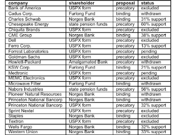 We deem investors the winner in two situations. At Hewlett-Packard, the company agreed to some yet-to-be-defined form of proxy access for 2013, so Amalgamated Bank withdrew its precatory proposal. And, Pioneer Natural Resources agreed to some other governance reforms (majority voting and declassified BoD), so Norges Bank withdrew its bylaw amendment.